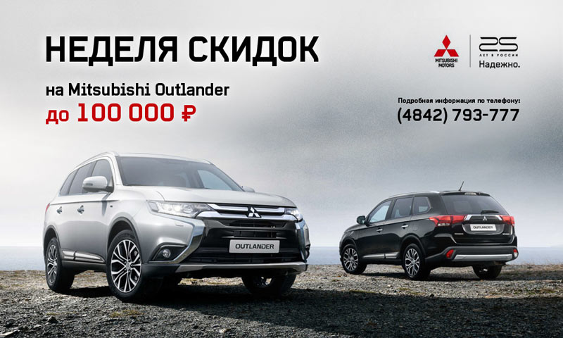 Неделя скидок на обновлённый Mitsubishi Outlander до 100 000 рублей. Успей до 11 октября! Подробная информация по телефону (4842) 793-777