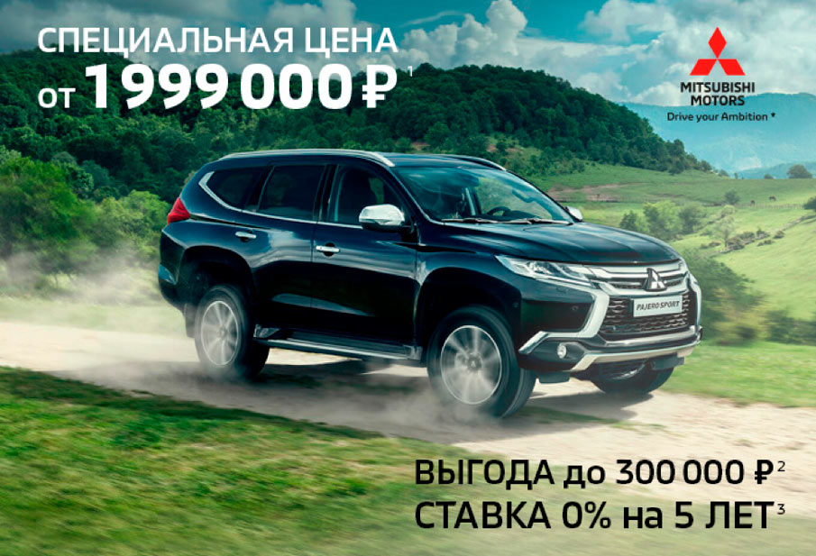 2. Выгода действует при сдаче в трейд-ин а/м любого бренда, за исключением а/м отечественного производства, достигших возраста 10 лет. Предложение ограничено, не является публичной офертой. На баннере изображен а/м Mitsubishi Pajero Sport 3.0 Ultimate 8AT.