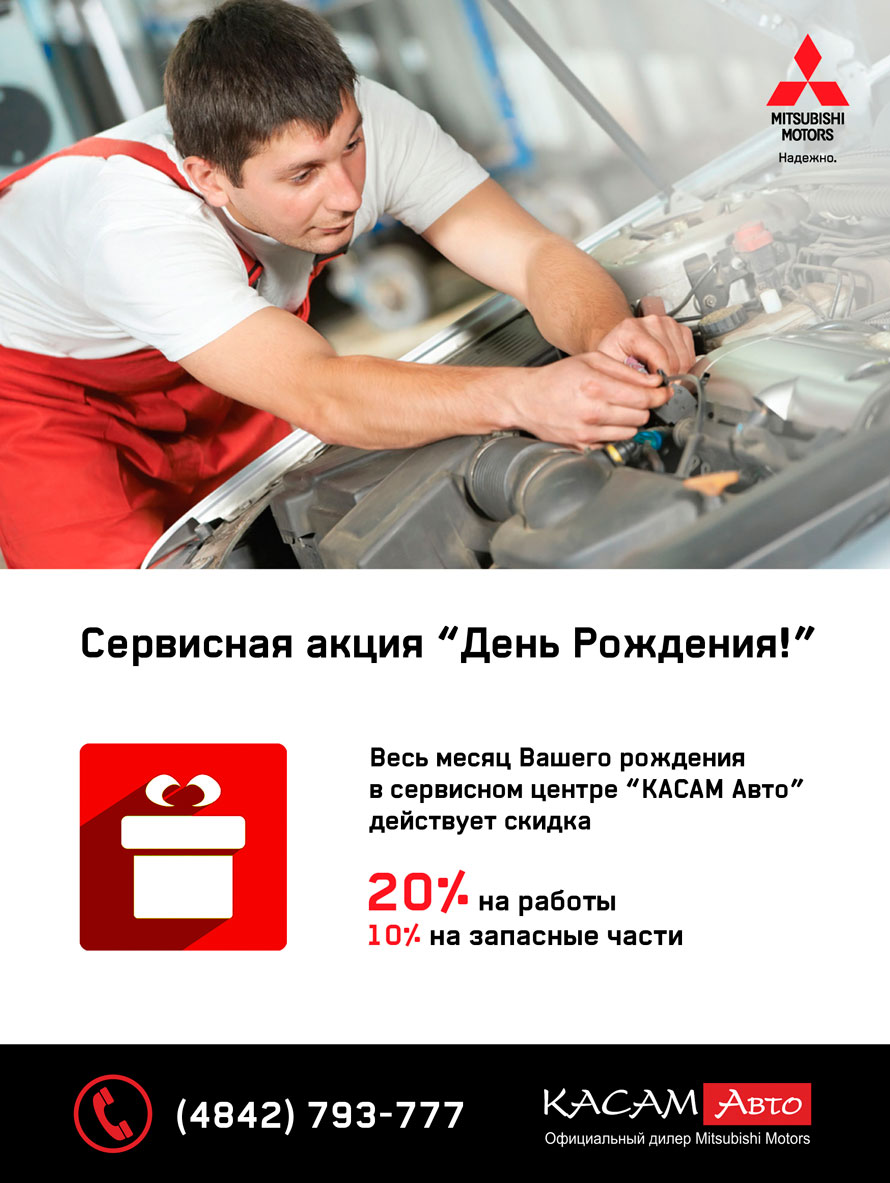 Отличная новость для клиентов Сервисного центра "КАСАМ Авто". Мы рады поздравить наших клиентов с Днем Рождения и по этому поводу весь месяц Вашего рождения мы дарим скидку 20% на работы и 10% на запасные части.